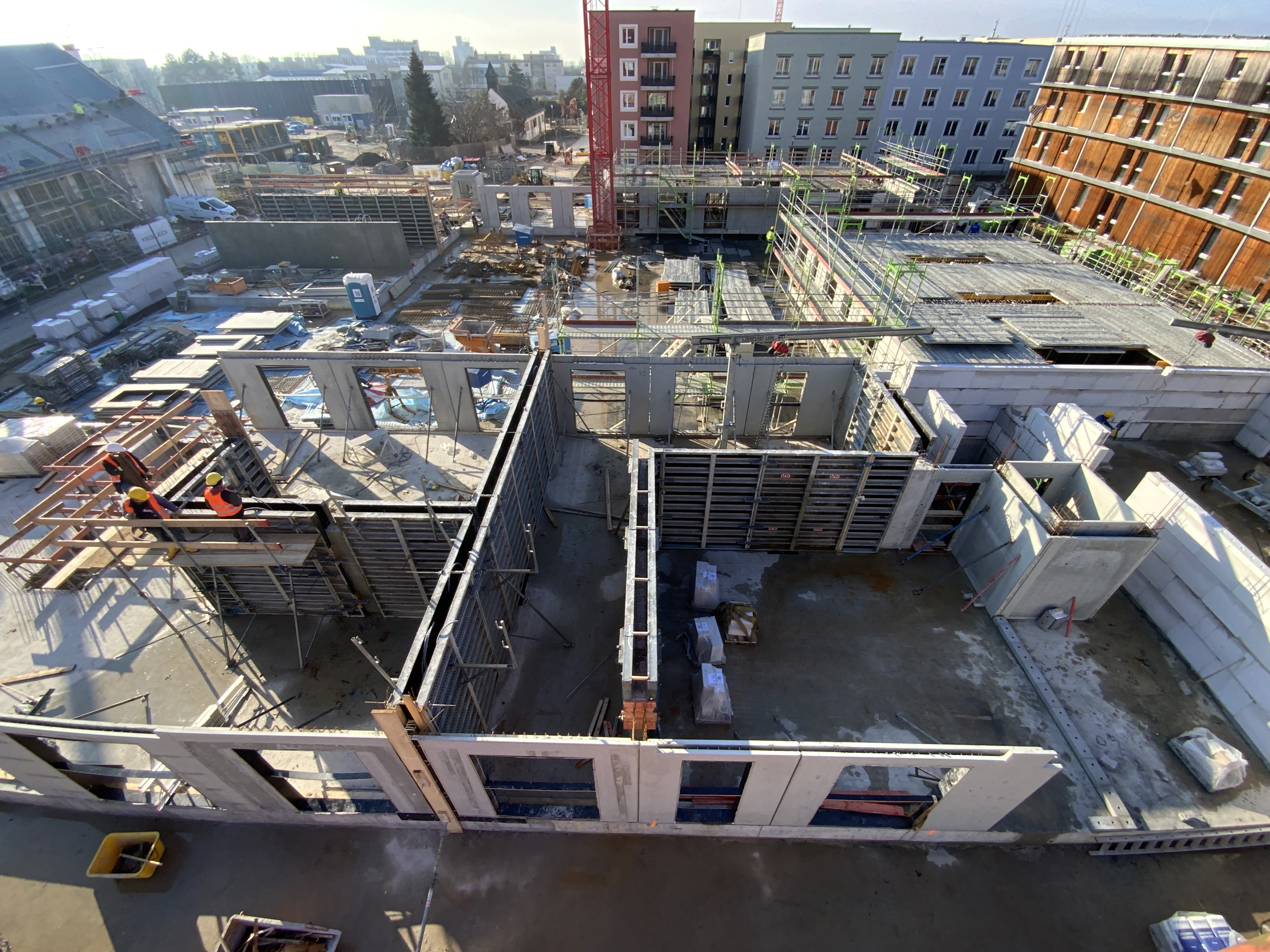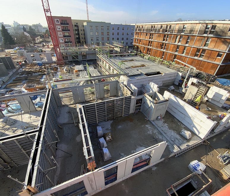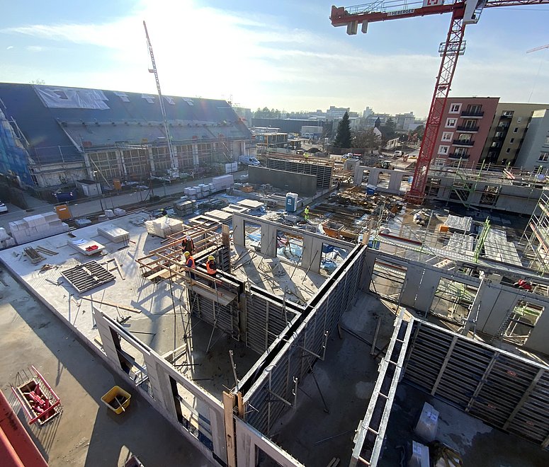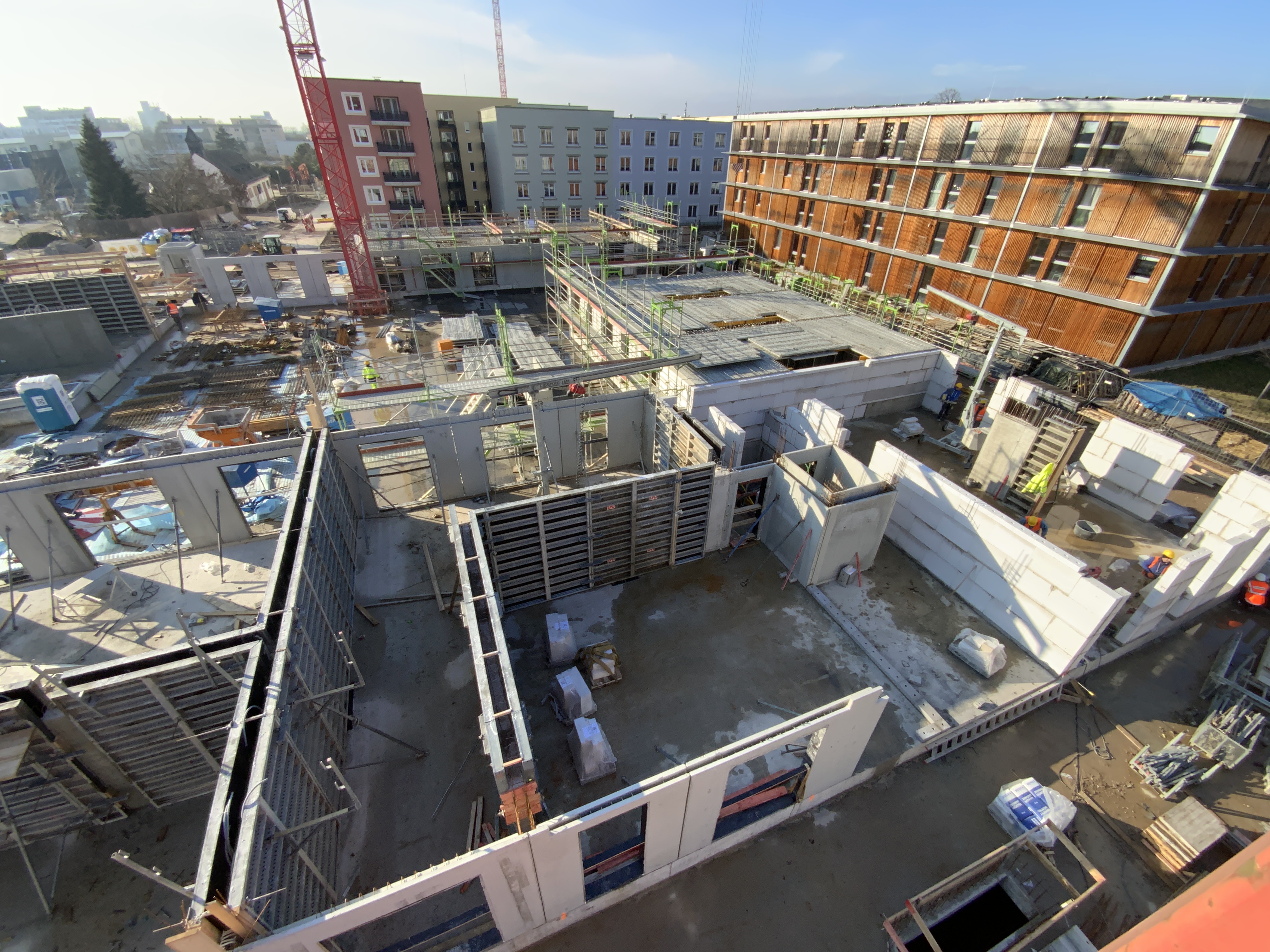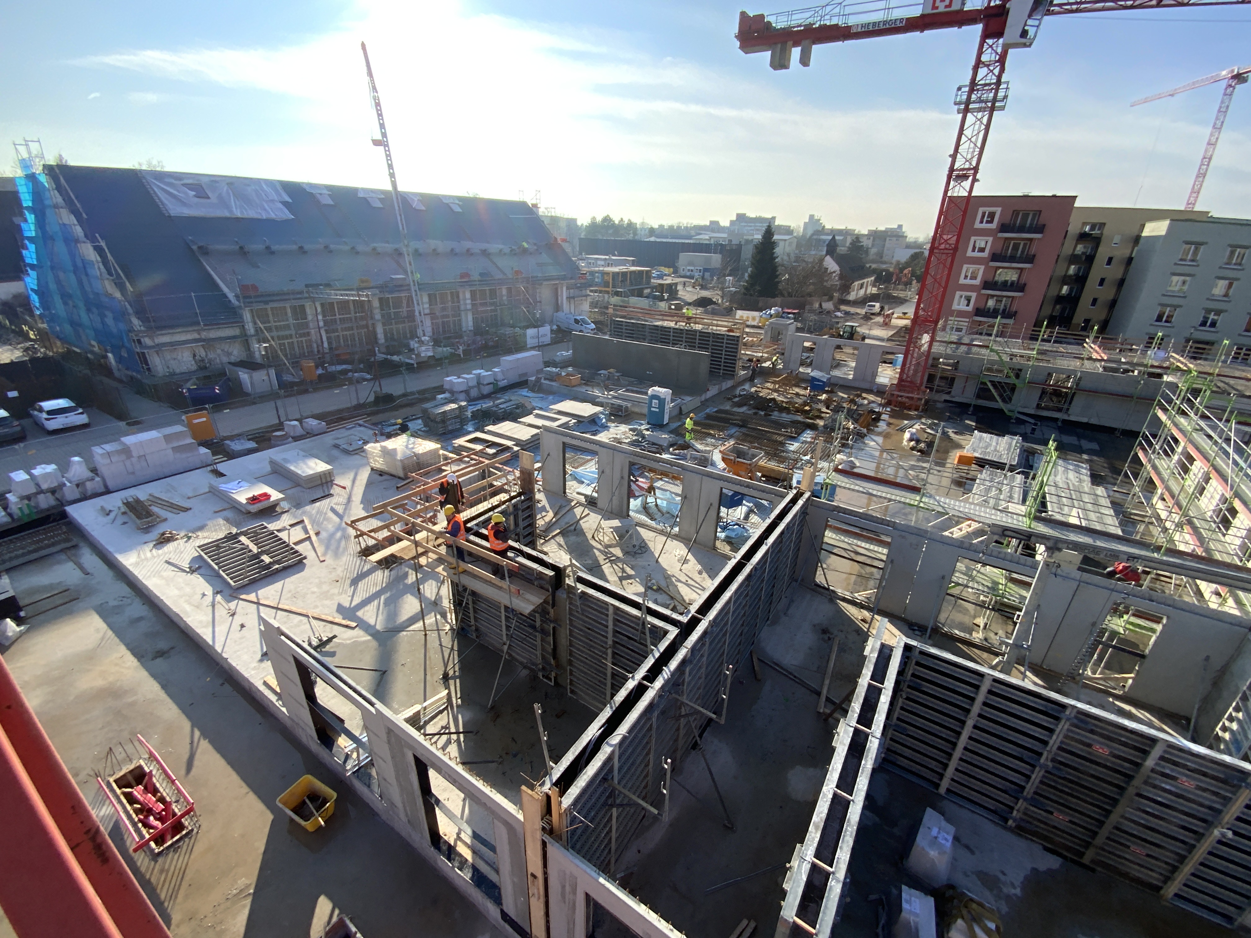 Der Rohbau des Bauvorhabens auf dem Hospital-Areal in Heidelberg entwickelt sich weiterhin planmäßig: Derzeit werden die verbleibenden Wände im Erdgeschoss erstellt. In Teilbereichen sind die Filigrandecken über dem Erdgeschoss bereits verlegt. Parallel dazu erfolgen – abhängig von den Witterungsbedingungen – Abdichtungsarbeiten auf der Decke im Innenhofbereich. Zudem wurde der Verbau vollständig zurückgebaut und die Arbeitsräume ordnungsgemäß verfüllt.
