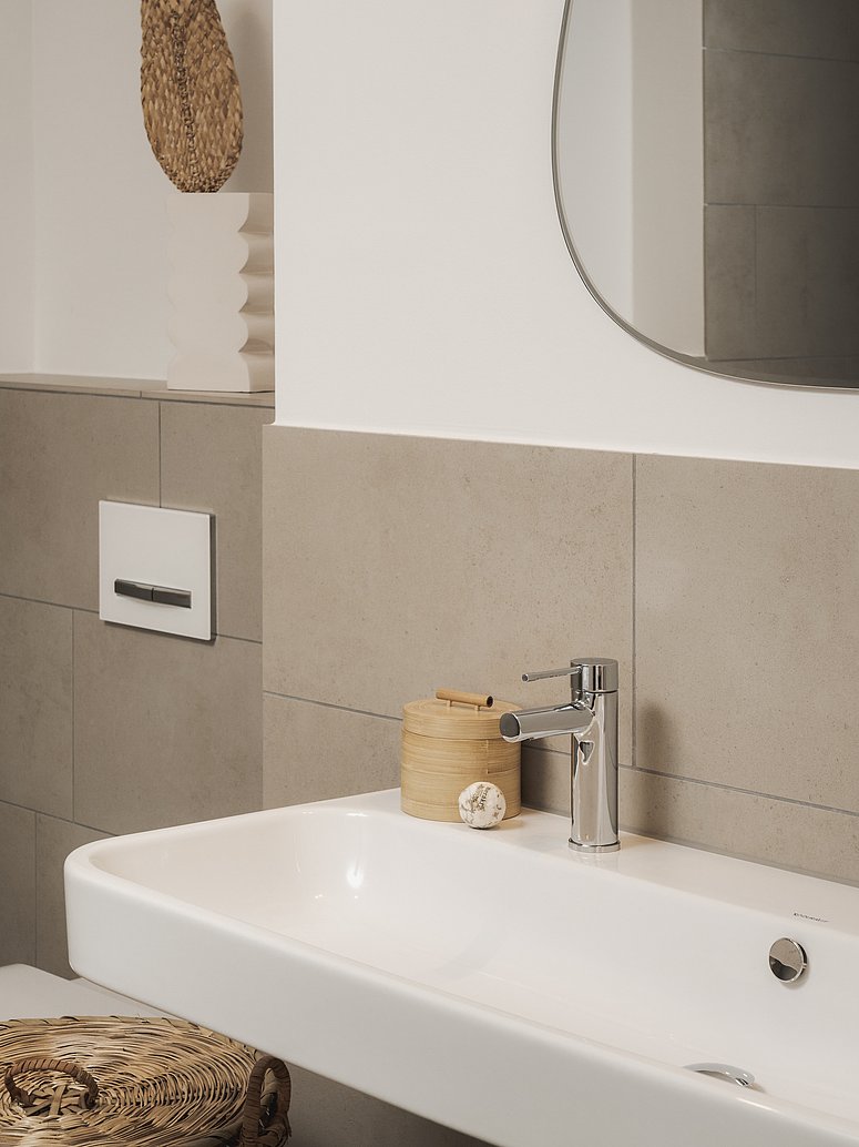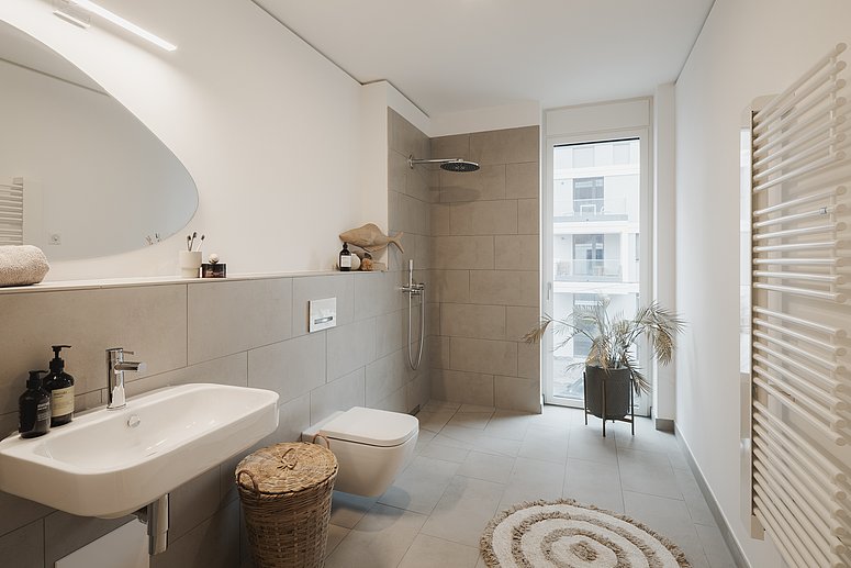 // Hochwertige Feinsteinzeugfliesen in den Bädern, WCs und Hauswirtschafts-/Technikräumen
