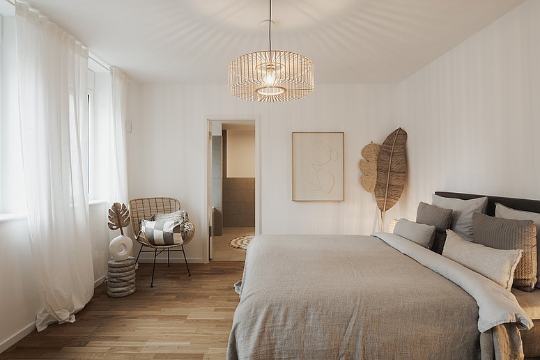 Das großzügige Masterschlafzimmer, ein weiteres flexibel nutzbares Zimmer sowie zwei stilvolle Bäder bieten Paaren und Familien gleichermaßen Raum für Rückzug, Alltag und Zukunftspläne. Die klare Zonierung in Aufenthalts- und Schlafbereiche unterstreicht den hohen Anspruch an Funktionalität und Privatsphäre.
