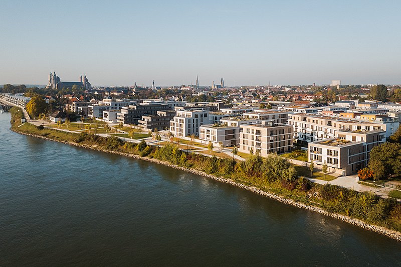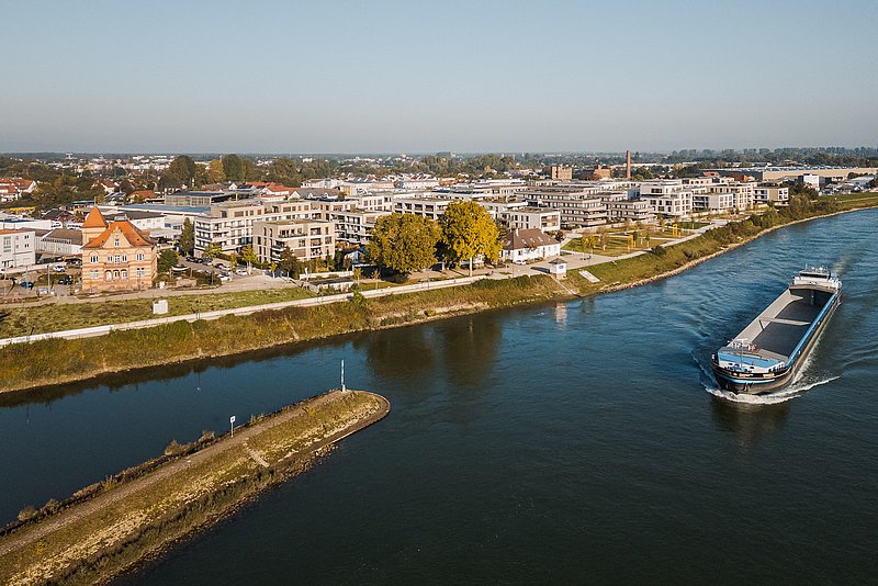 Bereits 2018 entstand mit PORT_SIDE das erste Wohnquartier AM FLUSS: ein Portal zum Hafen, zum Domgarten und zur schönen Speyerer Altstadt – und zugleich Zugang zum Rhein, und damit zum Wohnen und Leben am Wasser.